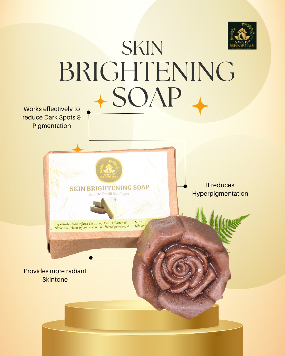 Our Skin Brightening Soap is specially formulated to gently cleanse while enhancing your skin’s natural radiance. Infused with carefully selected skin-loving ingredients, this soap helps reduce the appearance of dark spots, uneven skin tone, and dullness caused by environmental stressors and daily impurities.